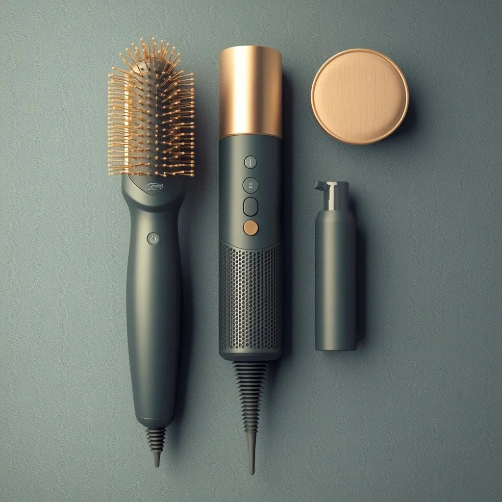 Kit di strumenti per la cura dei capelli, tra cui una piastra, un ferro arricciacapelli, un pettine e un dispenser di sapone