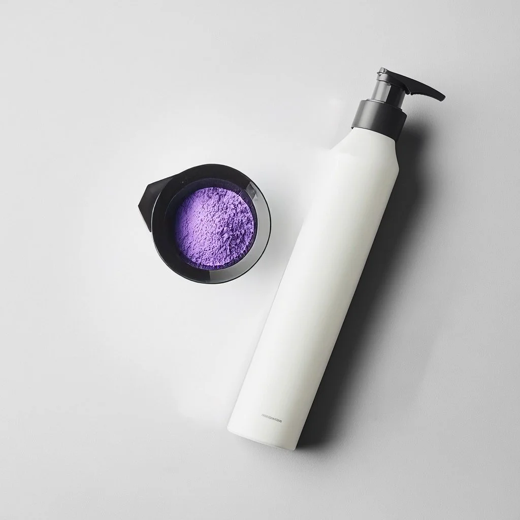 Bottiglia bianca di prodotto in plastica con tappo a pompa nero, e contenitore rotondo con polvere viola, su sfondo grigio chiaro.
