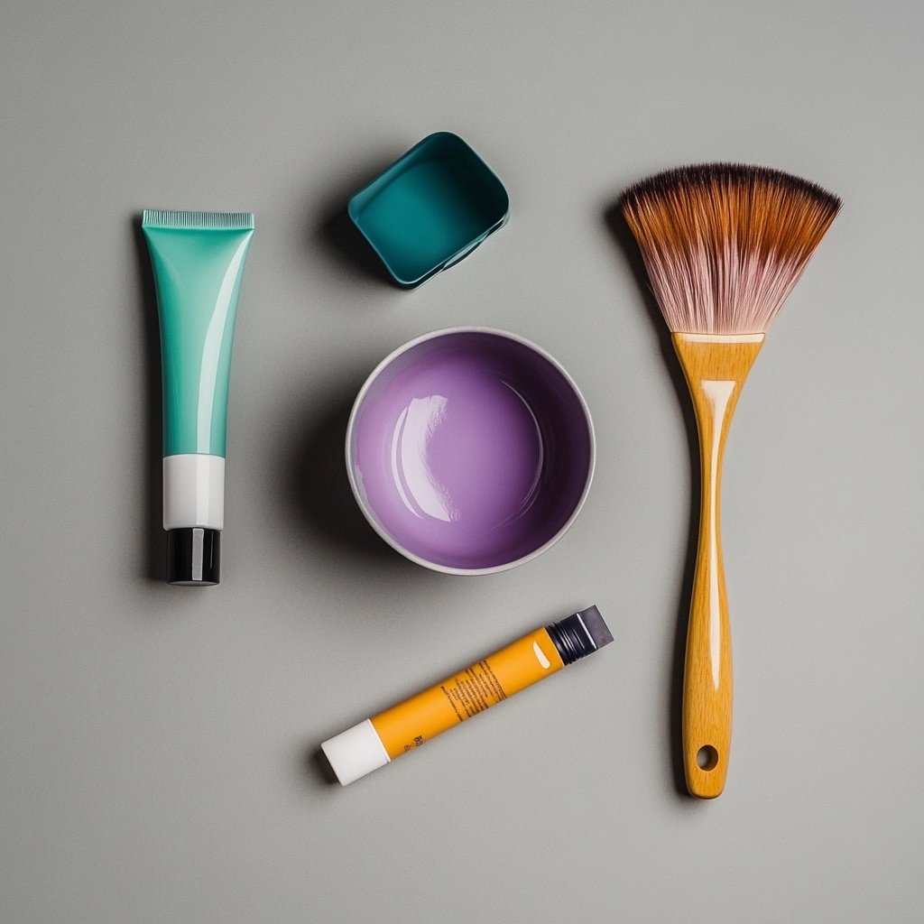 Set di strumenti per la cura del viso e del corpo, inclusi crema in tubo, piccola scatola blu, ciotola viola, spazzola da trucco e un tubo di crema o balsamo