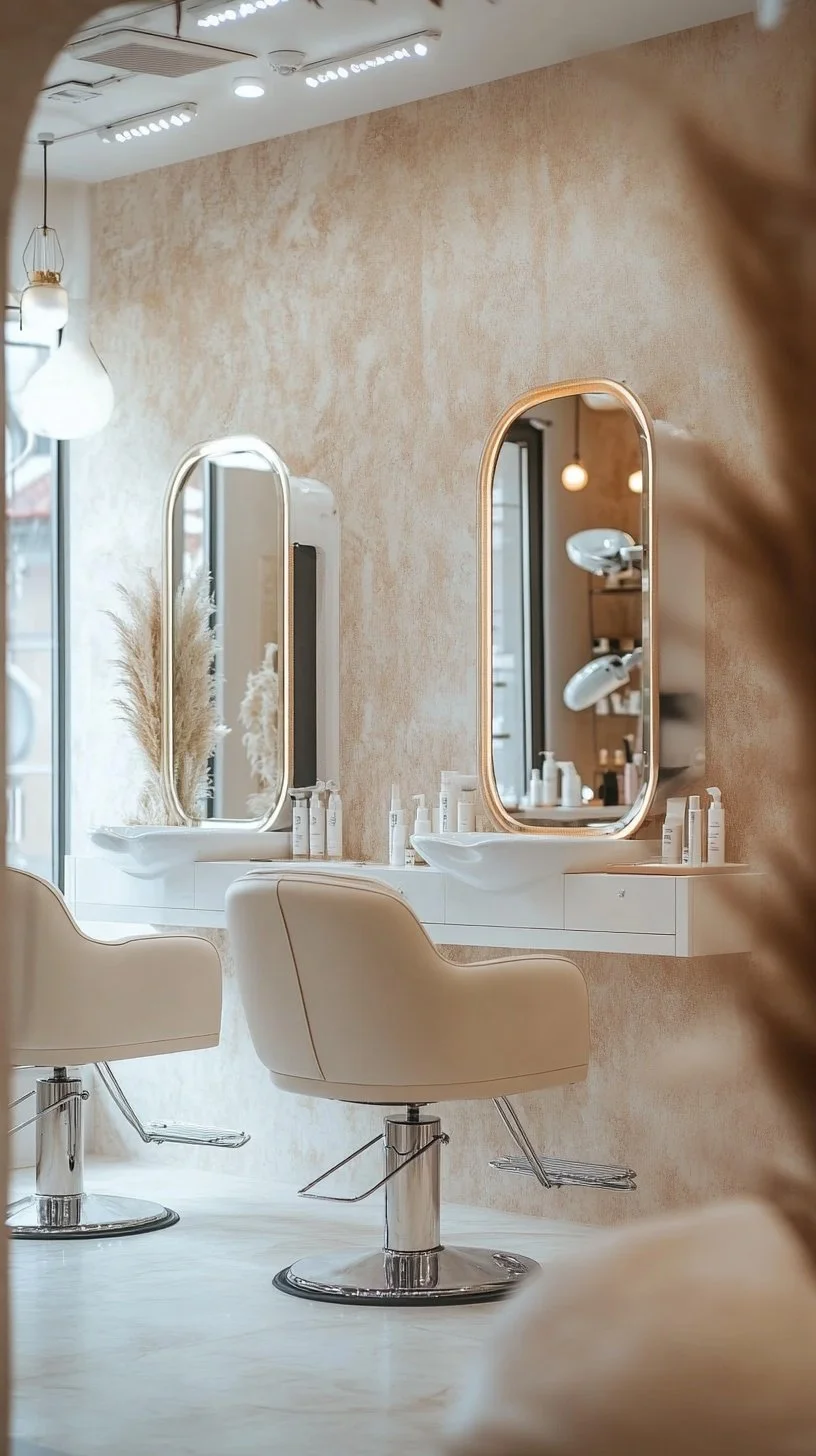Interno di un salone di bellezza con sedie da parrucchiere beige, due grandi specchi con cornici dorate, e prodotti per capelli sulla superficie del tavolo. Decorazioni minimaliste e pareti di colore beige chiaro.