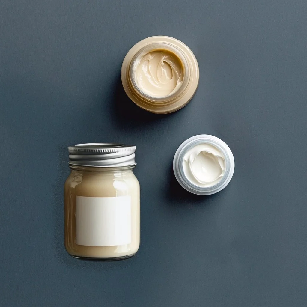 Tre barattoli di crema o lozione, uno grande con etichetta bianca vuota, uno aperto con crema beige, e uno più piccolo con crema bianca, su sfondo grigio.