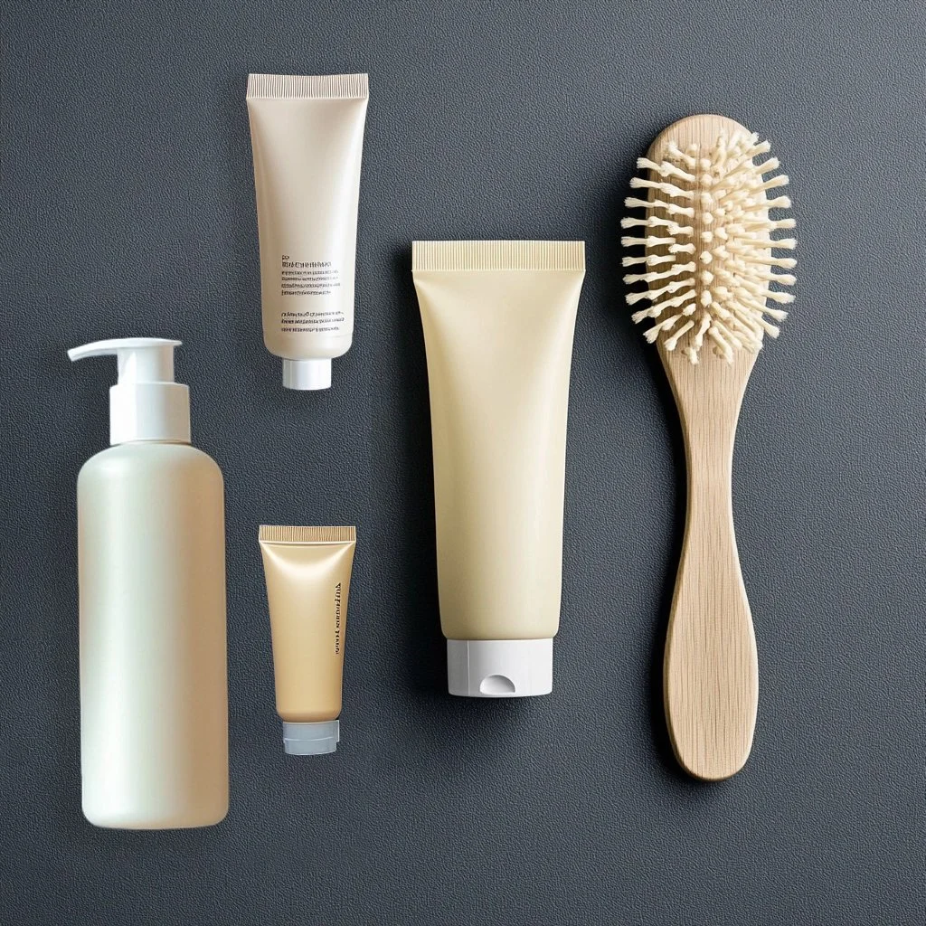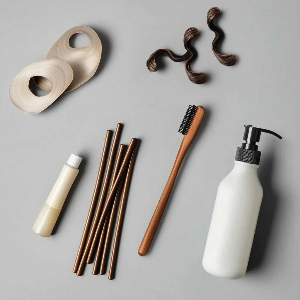 Prodotti per parrucchieri disposti su una superficie grigia, inclusi rotoli di nastri adesivi, ciocche di capelli ricci castani, spazzola in legno, bastoncini in metallo, flacone di lozione e spray e un dispenser di shampoo o balsamo.