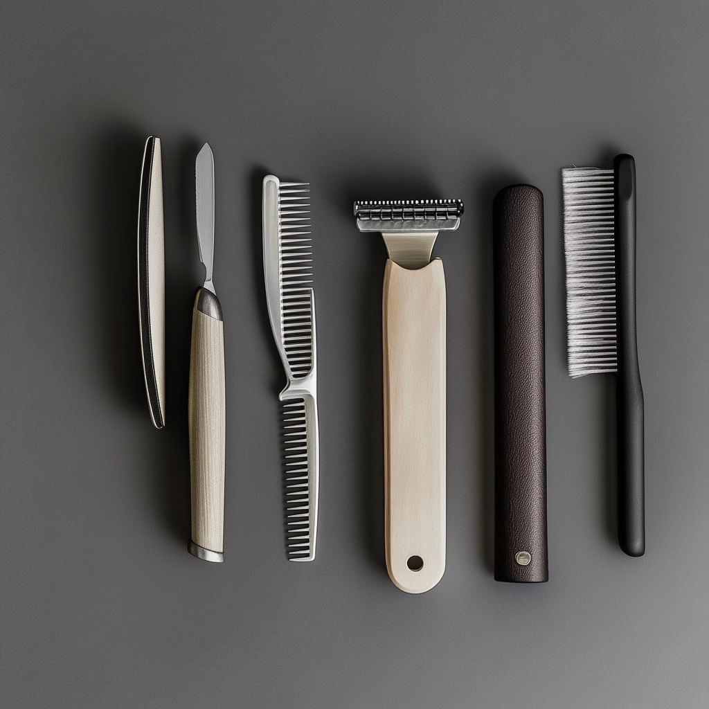 Set di strumenti da barbiere con rasoi, pettini, rasoio e spazzole disposti su una superficie grigia.
