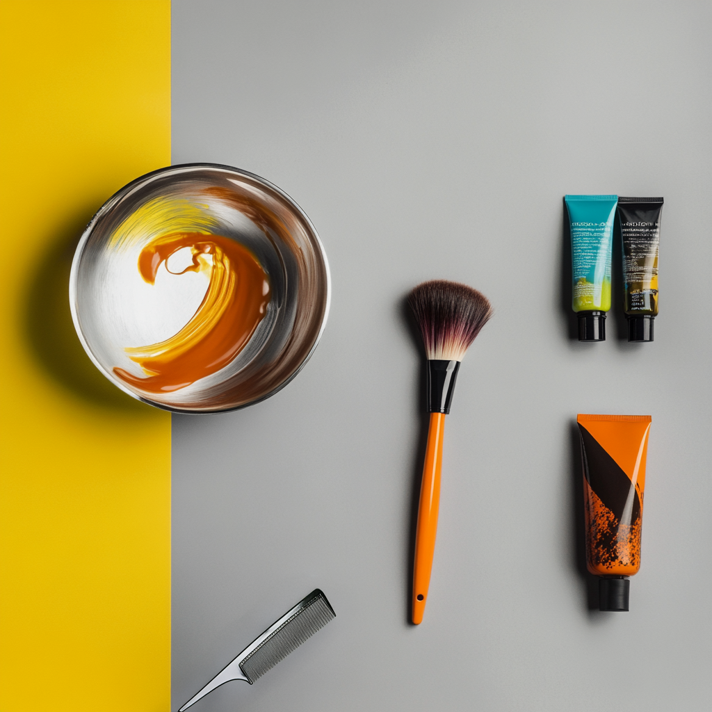 Capelli biondi con strumenti di colorazione e cura, inclusi un pettine, una spatola, una crema colorante e del foglio argentato.